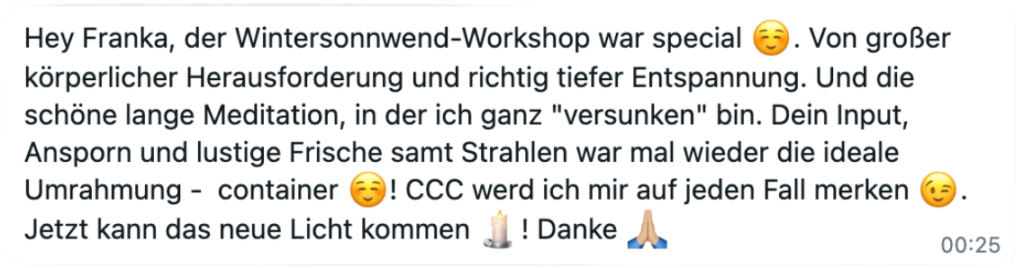 Den aktuellen monatlichen Stundenplan mit allen Online Events findest du immer in den Highlights auf meinem Instagram Profil @franka.friedenhautnah. Einzelne Klassen sind 20€, Workshops 33€, und es gibt monatliche Membership Optionen. Schreib mir einfach eine Nachricht auf Instagram oder eine Email an franka@frankarauch.com für alle Infos und wenn du dabei sein möchtest.
